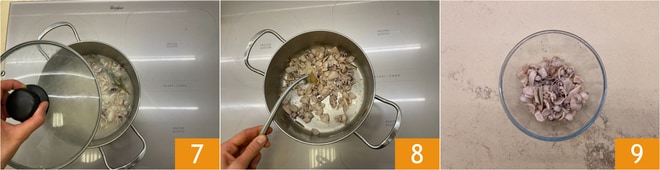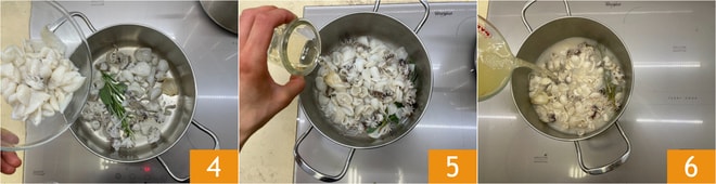 Ajoutez les seiches 4, faites-les sauter pendant deux minutes, déglacez avec 40 g de vin blanc 5, ajoutez un peu de bouillon 6