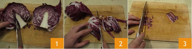 Pour préparer le risotto avec radicchio et pancetta, commencez par préparer le bouillon de légumes et gardez-le au chaud. Retirez la partie blanche de la tête de radicchio 1. Puis lavez, séchez et coupez les feuilles en fines tranches 2 3.