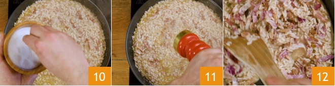 Portez à cuisson (cela prendra environ 18 minutes selon le riz que vous utilisez), en fin de cuisson salez 10, poivrez 11 à votre convenance. Enfin, ajoutez le radicchio hors du feu. Mélangez 12, assaisonnez avec du thym et vous êtes prêt à servir votre risotto avec radicchio et pancetta.