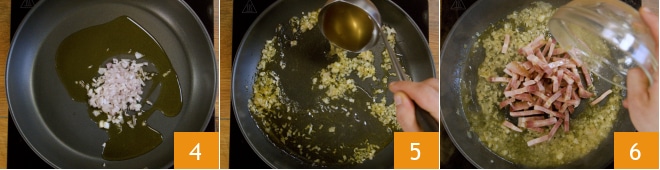 Dans une grande poêle, versez l'huile et l'échalote finement hachée 4. Faites revenir à feu doux, en remuant de temps en temps. Versez une louche de bouillon de légumes 5, après quelques instants ajoutez la pancetta coupée en fines lanières 6.