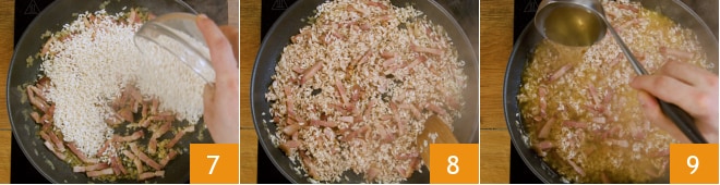 Laissez cuire la pancetta 1-2 minutes et mélangez de temps en temps. Ensuite, ajoutez le riz 7, mélangez à nouveau. Faites-le griller jusqu'à ce que les grains deviennent semi-transparents 8. Vous devrez ensuite déglacer avec le vin rouge et une fois évaporé, commencez à ajouter du bouillon chaud au besoin 9, une ou deux louches à la fois : le riz doit toujours être couvert.