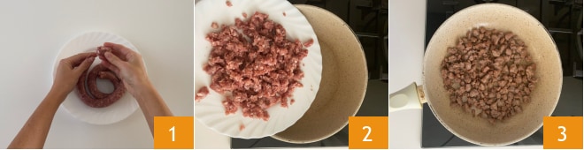 Pour préparer le risotto saucisse et épinards, commencez par mettre immédiatement le bouillon de légumes à chauffer. Retirez la peau de la saucisse et émiettez-la petit à petit 1. Ensuite, versez-la dans une poêle 2, faites rissoler à feu vif sans ajouter d'autres graisses et mélangez de temps en temps 3.