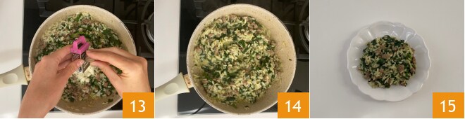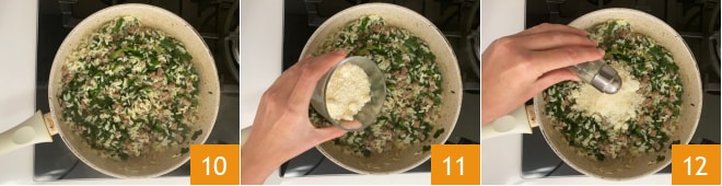 Faites cuire quelques instants, puis éteignez 10. Ajoutez le fromage râpé 11, salez à votre goût, ajoutez une pincée de poivre 12,