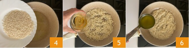 Mettez de côté la saucisse cuite et dans le même fond, versez un filet d'huile. Faites griller le riz jusqu'à ce qu'il devienne translucide 4. Déglacez avec le vin 5 et lorsque l'alcool se sera évaporé, ajoutez le bouillon de légumes chaud : mouillez-le de temps en temps selon le besoin 6.