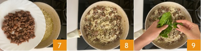 Quand il reste quelques minutes avant la fin de la cuisson du riz, ajoutez la saucisse 7 et mélangez 8, puis ajoutez aussi les épinards nettoyés et grossièrement déchirés à la main 9.