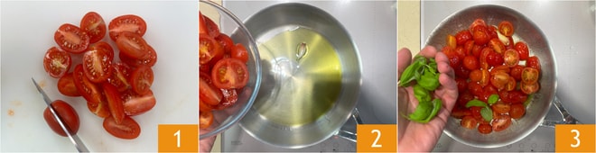 Pour préparer le risotto tomates cerises et burrata, commencez par couper en deux les tomates cerises 1. Mettez-les ensuite dans une poêle avec un filet d'huile et 1 ou 2 gousses d'ail 2. Ajoutez quelques feuilles de basilic 3 et faites cuire pendant 10 minutes.