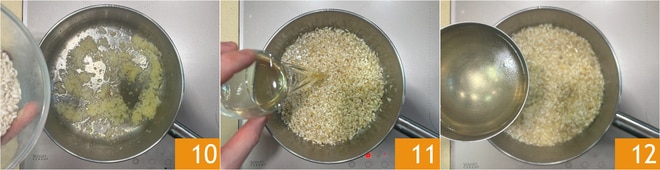 Ajoutez le riz 10, ajoutez le sel et faites-le griller jusqu'à ce qu'il soit très chaud au toucher et que les grains commencent à changer de couleur. Déglacez avec le vin blanc 11, et, une fois que toute la partie alcoolique s'est évaporée, poursuivez la cuisson du riz avec le bouillon de légumes 12. Ajoutez 1 ou 2 louches de bouillon chaud, de manière à recouvrir le riz juste à niveau. Remuez souvent et ajoutez plus de bouillon si nécessaire.