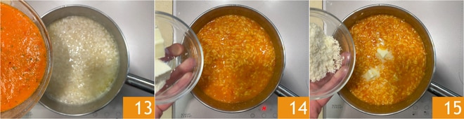 Quand il restera 4 minutes de cuisson, ajoutez la crème de tomates cerises 13. Une fois la cuisson du riz terminée, liez avec du beurre 14 et du parmesan 15.