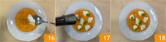 Dressez en disposant des petits tas de burrata sur le riz 16, complétez avec des feuilles de basilic, un filet d'huile et du poivre 17. Le risotto tomates cerises et burrata est prêt à être servi 18.