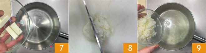 Dans une casserole, faites fondre le beurre 7. Pendant ce temps, hachez un demi-oignon 8, ajoutez-le avec le beurre 9 et faites-le suer pendant quelques minutes.