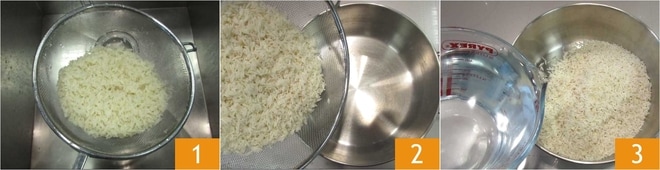 Pour préparer le riz au curry, commencez par rincer le riz basmati sous l'eau courante 1, puis versez-le dans une casserole 2 avec l'eau 3 et le sel.