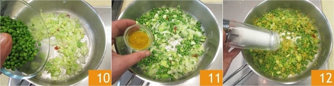 Ajoutez les petits pois 10 et le curry 11, mélangez bien et faites cuire à feu moyen pendant 3-4 minutes, en ajustant le sel 12.