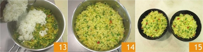 Maintenant, ajoutez le riz 13, mélangez pour bien incorporer le tout et laissez sur le feu pendant encore 1-2 minutes 14. Votre riz au curry est prêt à être servi 15 !