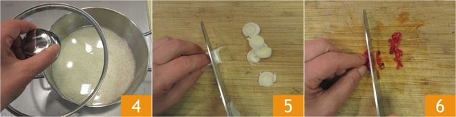 Couvrez avec un couvercle 4 et portez à ébullition. Lorsque l'eau commence à bouillir, baissez le feu et faites cuire pendant environ 8 minutes. Pendant ce temps, nettoyez et coupez le poireau en rondelles 5, puis hachez les piments après avoir retiré les graines 6.