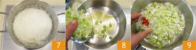 À ce stade, le riz sera cuit, éteignez donc le feu et laissez reposer pendant 10 minutes 7. Pendant ce temps, chauffez l'huile dans une grande poêle, ajoutez le poireau 8 et le piment 9, et faites-les revenir à feu doux pendant environ 5-6 minutes.