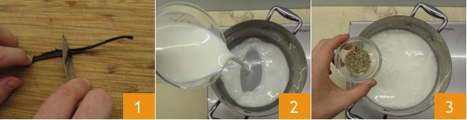 Pour préparer le riz au lait au safran, commencez par l'infusion. Incisez la gousse de vanille et grattez les graines 1. Ensuite, passez aux fourneaux et versez dans une casserole le lait d'amandes 2. Puis ajoutez les graines de fenouil 3,