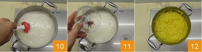 et faites cuire pendant 25 minutes en remuant de temps en temps à feu moyen 10, le mélange ne doit jamais bouillir, sinon le liquide s'évaporera trop rapidement. Une fois le temps écoulé, ajoutez les pistils de safran 11, en en réservant quelques-uns pour la décoration, et continuez à mélanger de temps en temps en laissant cuire encore 25 minutes. Au total, le riz au lait cuira environ 50 minutes : à la fin de la cuisson, il doit être moelleux et crémeux, un peu comme un flan 12.