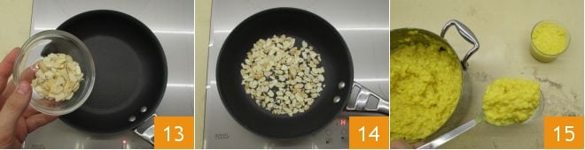 Entre-temps, versez dans une poêle les amandes effilées 13 et faites-les griller à feu vif 14, en les sautant souvent pour éviter qu'elles ne brûlent. Répartissez la préparation dans 6 verres d'une capacité de 150 ml 15.