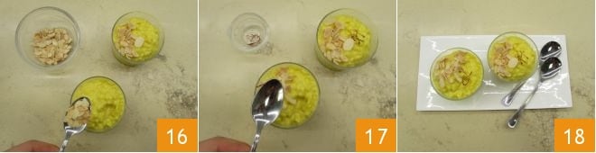 Ensuite, garnissez les verres avec les amandes grillées 16 et quelques pistils 17. Vos verres de riz au lait au safran sont prêts, il ne vous reste plus qu'à les déguster 18 !