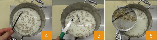 la gousse 4 et ses graines 5, et laissez chauffer le tout pendant 10 minutes à feu doux, sans jamais atteindre l'ébullition. À ce stade, filtrez le liquide à l'aide d'une passoire fine 6, de manière à éliminer le fenouil et la gousse de vanille.