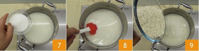 Versez le sucre dans le lait 7, augmentez la température jusqu'à frôler l'ébullition tout en mélangeant avec une spatule pour faire fondre le sucre 8. Ajoutez le riz 9