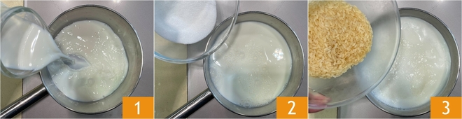 Pour préparer le riz au lait aux fruits rouges, commencez par verser le lait 1 et le sucre 2 dans une casserole, mélangez et portez à ébullition. À ce stade, ajoutez le riz 3.