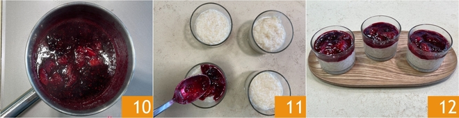 Faites cuire à feu moyen pendant une dizaine de minutes 10. À ce stade, sortez les verrines du réfrigérateur et garnissez la surface avec le coulis obtenu 11. Votre riz au lait aux fruits rouges est prêt à être dégusté 12 !