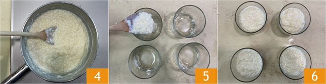 Continuez à cuire en remuant à feu doux pendant environ 30 minutes, jusqu'à ce que le riz ait absorbé tout le lait : vous devez obtenir une consistance crémeuse 4. Répartissez le mélange dans 4 verrines d'une capacité de 190 ml chacune 5 et placez au réfrigérateur pour raffermir 6.