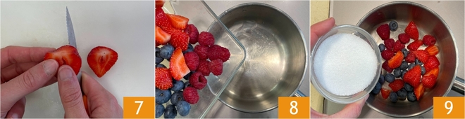 Pendant ce temps, préparez le coulis de fruits rouges : lavez les fraises et coupez-les en morceaux selon leur taille 7. Versez les fraises, les myrtilles et les framboises dans une casserole 8 avec le sucre 9.