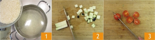 Faites sauter les aubergines avec un filet d'huile dans une poêle 4 jusqu'à ce qu'elles soient bien dorées, puis salez, poivrez 5 et mettez de côté. À ce stade, le riz sera cuit, égouttez-le 6 et laissez-le tiédir.