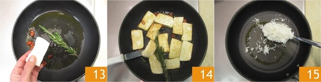 Coupez maintenant le tofu en tranches de 1 cm d'épaisseur 10 et coupez le piment en rondelles 11. Versez un filet d'huile dans une autre poêle, ajoutez la branche de romarin 12 et le piment, et chauffez à feu doux.