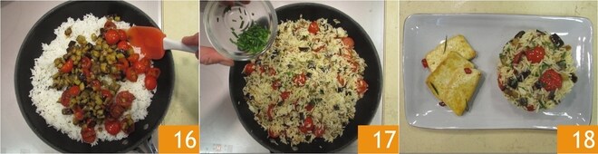 Déposez les tranches de tofu 13, augmentez le feu et faites-les dorer des deux côtés pendant quelques minutes pour qu'elles soient dorées et légèrement croquantes 14, puis mettez de côté. Dans la même poêle, ajoutez encore un filet d'huile et le riz 15.