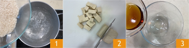 Pour préparer le riz basmati au tofu à la sauce soja et légumes sautés, commencez par verser le riz dans une grande quantité d'eau salée 1 et faites-le cuire le temps indiqué sur l'emballage. Pendant ce temps, occupez-vous des autres ingrédients : coupez le tofu en dés, puis versez dans un bol le sirop d'érable 3.