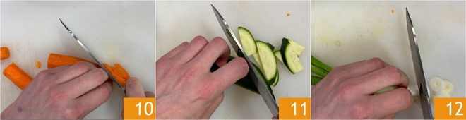 Épluchez et parez les carottes, coupez-les en deux dans la longueur et taillez-les en losanges d'environ 3-4 mm d'épaisseur 10. Faites de même avec les courgettes 11. Enfin, émincez la ciboule 12.