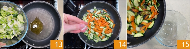 Dans une poêle antiadhésive, faites chauffer un filet d'huile, puis ajoutez les légumes 13 et faites-les sauter à feu vif pendant quelques minutes, en salant légèrement 14. Lorsqu'ils sont dorés mais encore croquants, réservez-les 15.