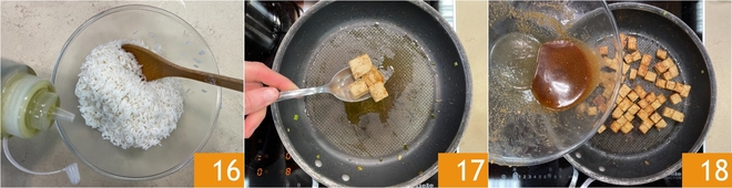 Pendant ce temps, le riz sera cuit ; égouttez-le dans un bol et assaisonnez-le d'un filet d'huile 16. Sortez le tofu de la marinade et mettez-le dans la même poêle où vous avez cuit les légumes 17, puis faites-le sauter pendant deux minutes à feu vif jusqu'à ce qu'il soit bien doré. Versez ensuite le liquide de la marinade 18 et un trait d'eau, mélangez bien et éteignez le feu.