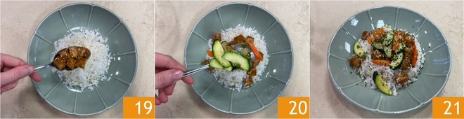Vous êtes prêts à dresser : disposez le riz à la base, ajoutez ensuite le tofu avec sa sauce 19 et les légumes 20. Terminez par des graines de sésame noir et blanc et de la ciboulette ciselée. Votre riz basmati au tofu à la sauce soja et légumes sautés est prêt à être dégusté 21 !