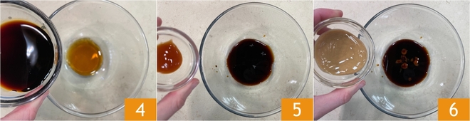 Ajoutez la sauce soja 4, la sauce sriracha 5 et le beurre de cacahuète 6.