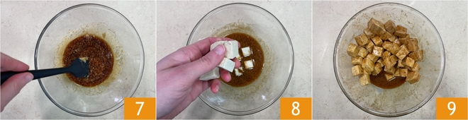 Mélangez bien la préparation 7, puis ajoutez les dés de tofu 8 et mélangez avec les mains pour bien les enrober 9. Laissez mariner pendant que vous poursuivez la recette.