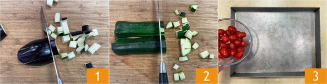 Pour préparer le riz tiède avec pois chiches, légumes rôtis et feta, commencez par laver les légumes, puis coupez les extrémités des aubergines et taillez-les en cubes d'environ 1,5 cm 1. Faites de même avec les courgettes 2. Dans un plat, versez les tomates cerise 3.