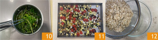 Laissez cuire pendant 10 minutes à feu très doux. Enlevez les herbes 10 et laissez refroidir. Sortez les légumes du four 11. Égouttez le riz et transférez-le dans un bol 12.