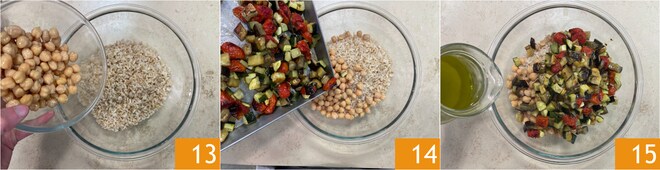 Versez les pois chiches égouttés dans le riz 13, incorporez également les légumes 14 et assaisonnez avec l'huile aromatisée 15.