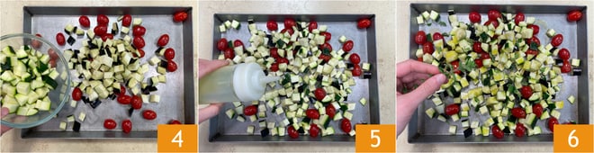 Ajoutez également les aubergines et les courgettes 4, assaisonnez avec de l'huile 5, du sel, du poivre et de l'origan frais 6, cuisez au four statique à 230° pendant 20 minutes.