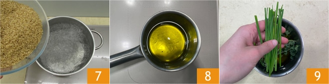 Entre-temps, faites bouillir le riz complet dans de l'eau salée pendant le temps indiqué sur l'emballage 7. Préparez en même temps l'huile aromatisée en mettant l'huile dans une petite casserole 8 avec les herbes fraîches que vous avez à la maison 9 (romarin, ciboulette, fenouil, origan, marjolaine, basilic, persil ou thym).