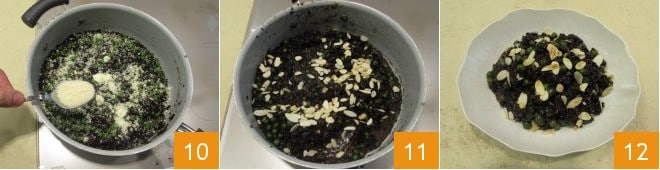 le fromage râpé 10, mélangez pour amalgamer puis terminez en ajoutant les amandes grillées 11. Servez le riz vénus au curry bien chaud 12.