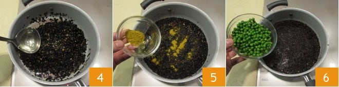 Laissez griller le riz quelques instants, puis ajoutez le bouillon de légumes chaud, une louche à la fois 4, en attendant que le liquide soit absorbé avant d'en ajouter d'autre. Cuisez pendant 10 minutes, puis ajoutez le curry 5, mouillez immédiatement avec le bouillon et mélangez pour assaisonner le riz, puis ajoutez les pois 6 et cuisez encore pour 10-15 minutes en ajoutant toujours le bouillon peu à peu jusqu'à ce que le riz soit cuit. Rectifiez l'assaisonnement avec du sel et du poivre si nécessaire.