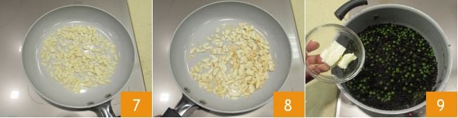 Entre-temps, mettez les amandes dans une poêle 7 et faites-les griller quelques minutes 8. Une fois la cuisson terminée, éteignez le feu et liez le riz avec le beurre 9,