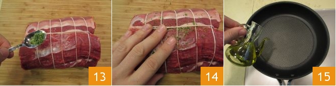 et faites bien dorer la viande de tous les côtés (16-17), en veillant à ne pas la percer. Ne soyez pas pressé, et seulement lorsque la viande est bien dorée, transférez-la à nouveau sur la planche à découper 18.