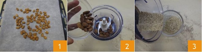 Pour préparer les roccocò, commencez par griller les amandes avec la peau. Pour ce faire, il suffit de les disposer sur une plaque de cuisson et de les mettre au four préchauffé à 180° pendant 5 minutes 1. Une fois grillées, sortez-les du four, laissez-les tiédir un instant puis versez-en 50 grammes dans un mixeur 2 et mixez jusqu'à obtenir une consistance suffisamment sableuse ; gardez les autres de côté 3.