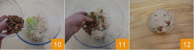 Ajoutez le cédrat coupé en dés avec 50 grammes d'amandes entières 10, mélangez également ces ingrédients à la pâte puis transférez le tout sur le plan de travail 11. Continuez à pétrir jusqu'à obtenir une boule lisse 12.